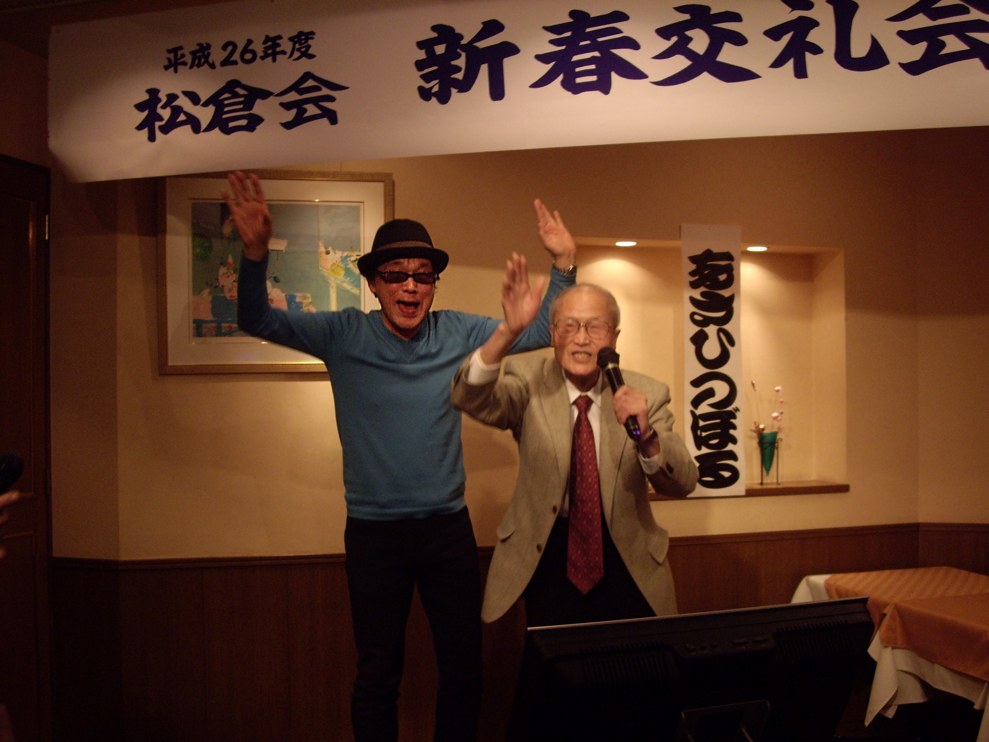 一枚目の写真は大盛り上がりのオイラ!二枚目の写真は「浅草の唄」を唄う松倉会長とオイラ。